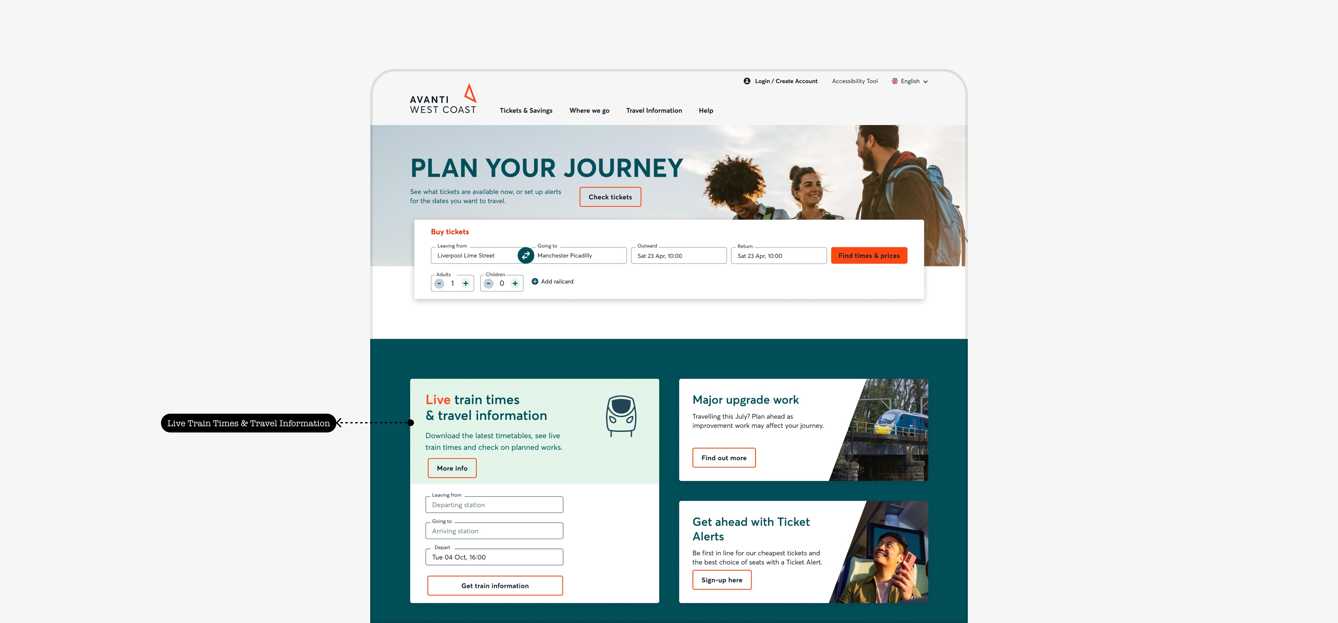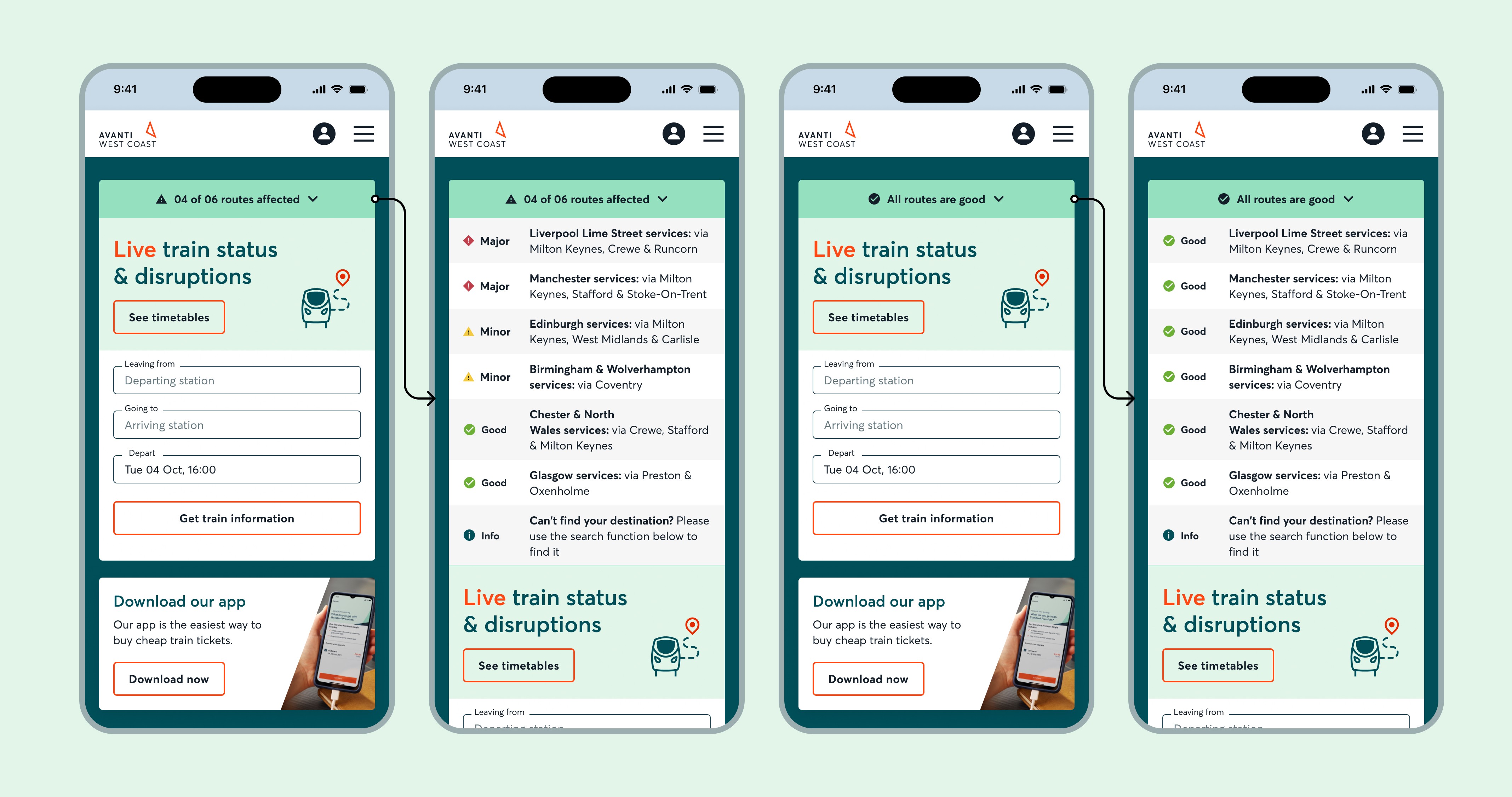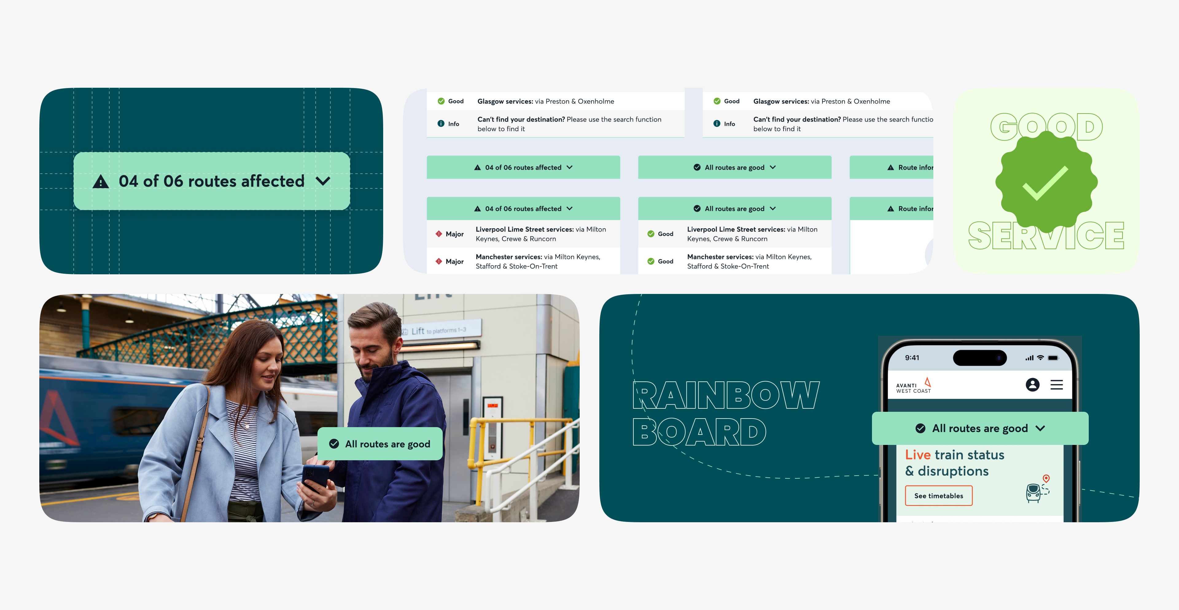 As the rainbow board should be positioned in the top fold of the homepage we agreed upon combining rainbow board with the Live Train Status component making it more useful than ever. This allows people to see overall disruptions in the network and they also can search for specific routes and times to see if their journey is effected or not.