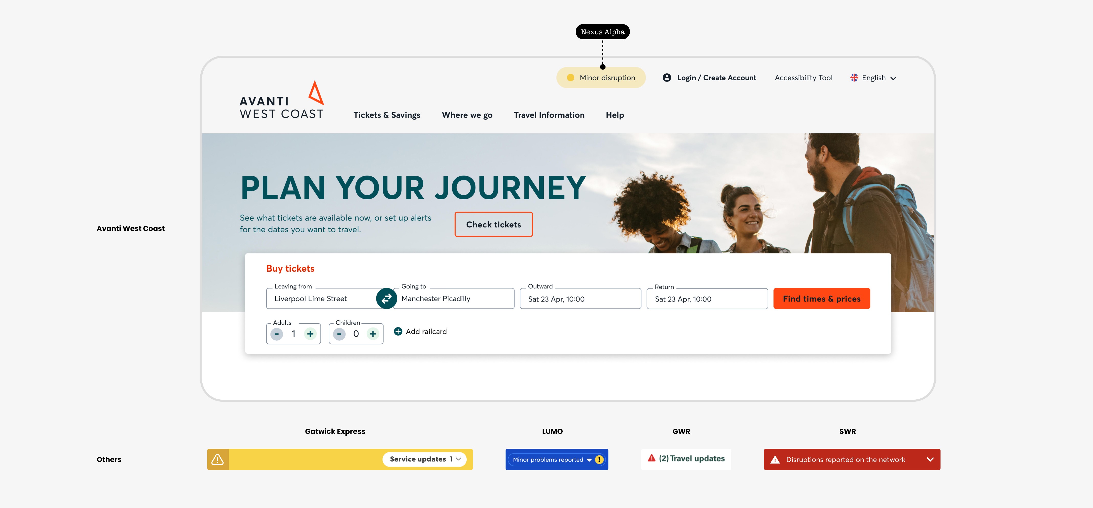 If you’ve visited the website of any UK train operating company, such as Avanti West Coast, GWR, SWR, or Gatwick Express, you might have encountered a component like the one shown below. We used to call it “The Nexus Alpha”. Usually found in the top of the navigation. The name comes from the API, Nexus Alpha, which provides the data for this feature. The idea was simple…